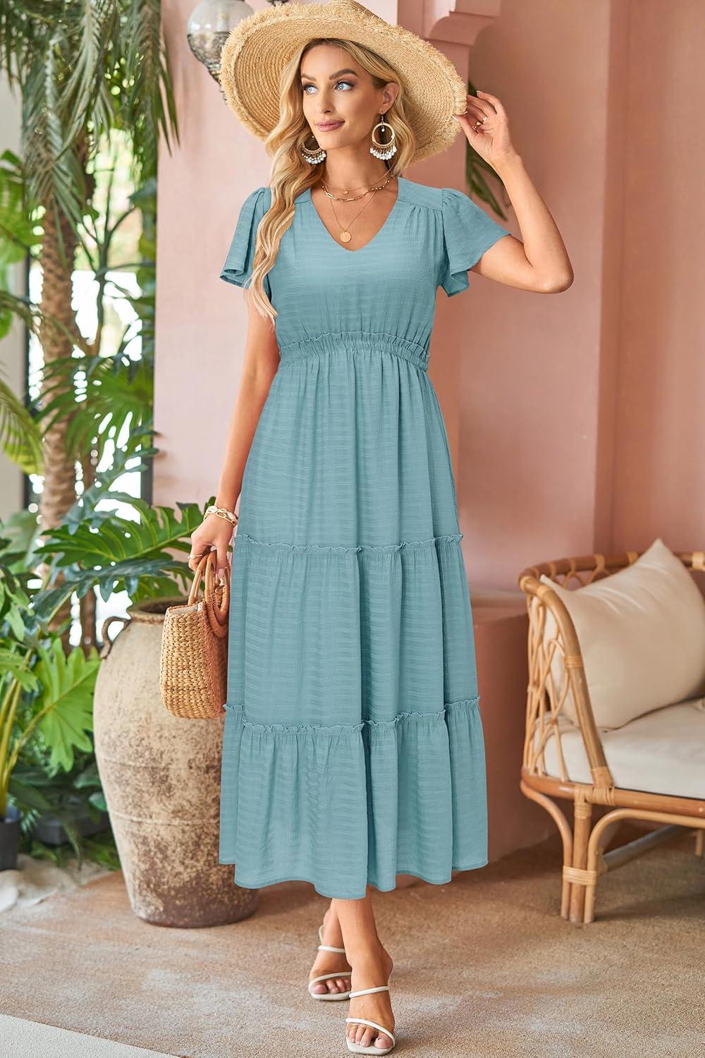 VOTEPRETTY Women’s 2024 Fashion Summer Maxi Dresses Boho Beach V Neck Flutter Short Sleeve Tiered Long Dress(Blue Green)