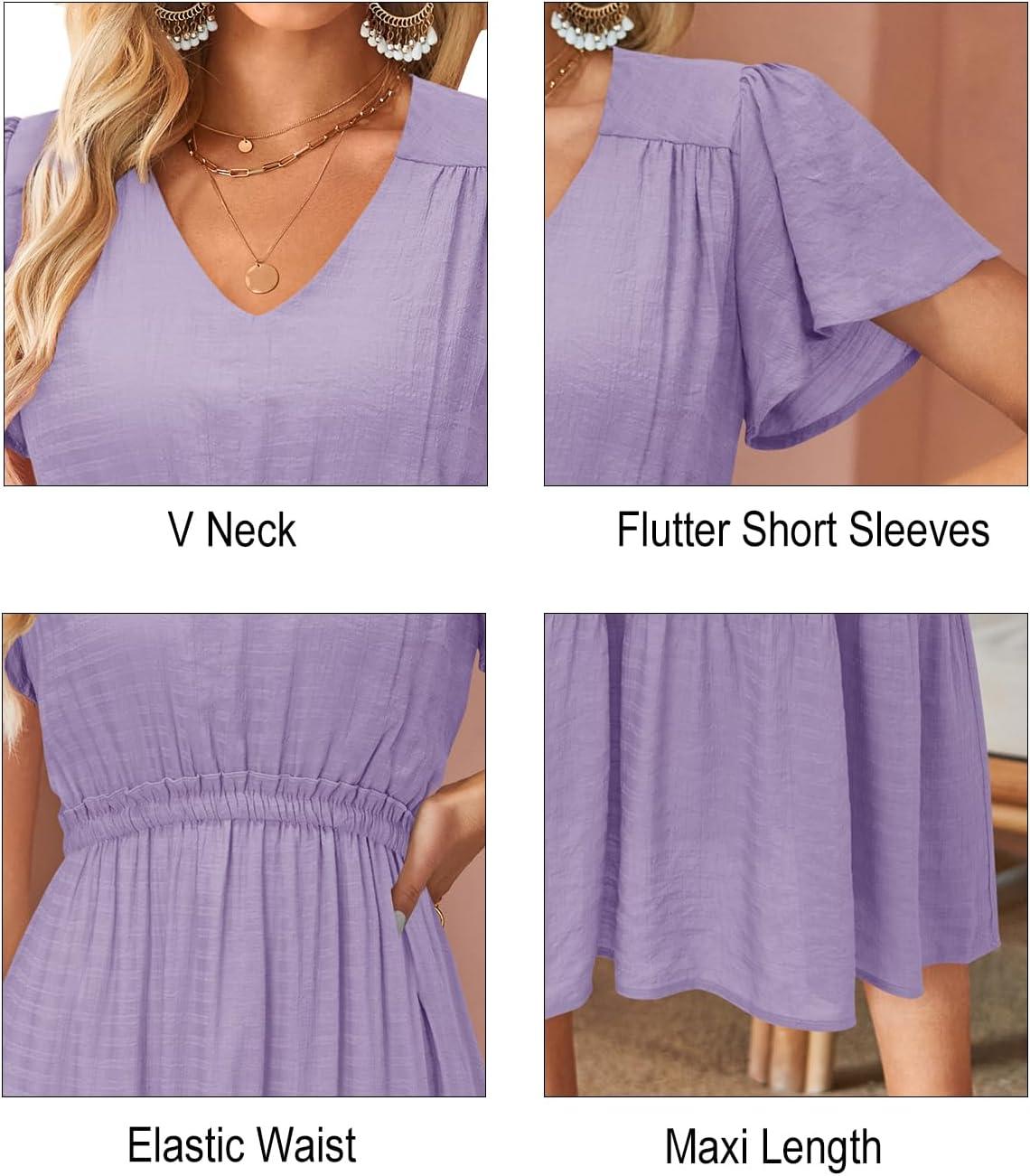 VOTEPRETTY Women’s 2025 Summer Boho Maxi Dresses Flutter Short Sleeve V Neck Casual Beach Wedding Guest Vacation Long Dress(Light Purple)