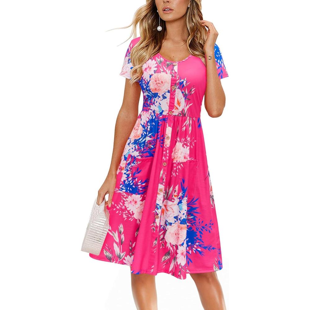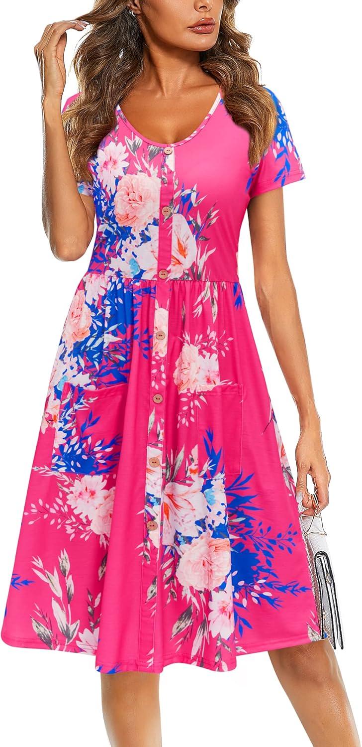VOTEPRETTY Women’s Short Sleeve V Neck Sundress Summer Casual Button Floral Dress with Pockets(Floral20)