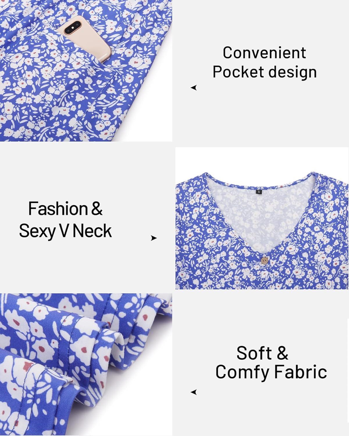 VOTEPRETTY Women’s Short Sleeve V Neck Sundress Summer Casual Button Floral Dress with Pockets(Slateblue Floral White)