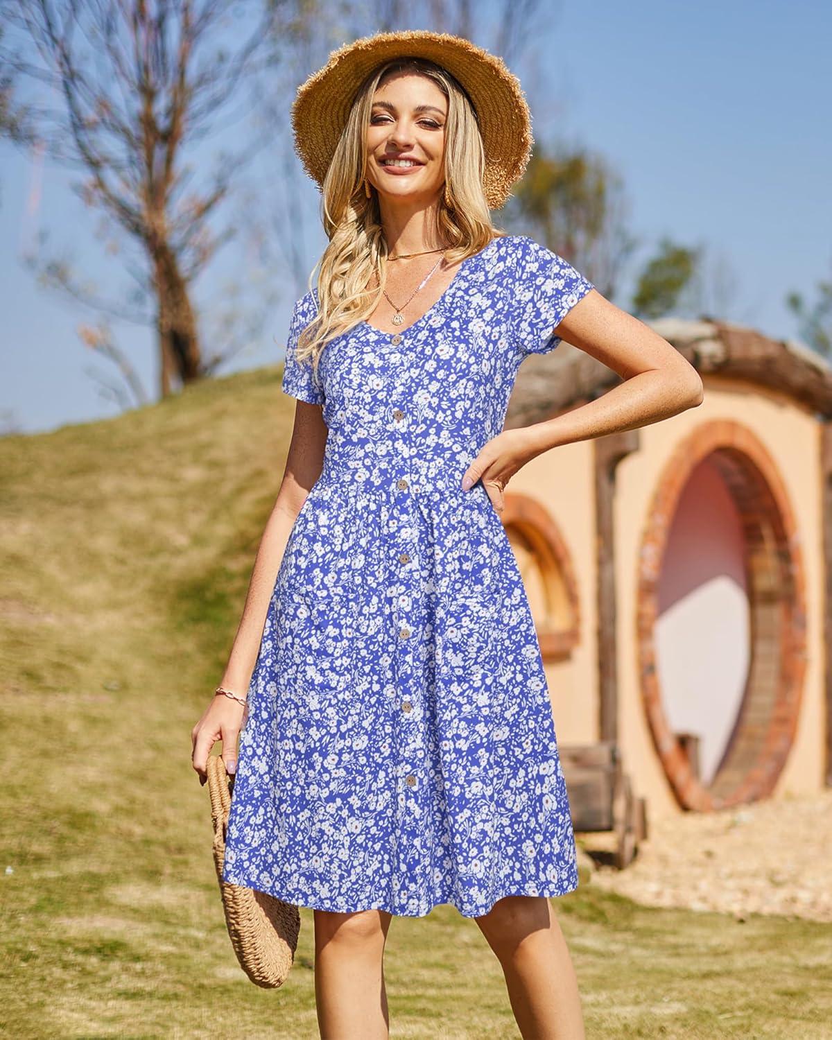 VOTEPRETTY Women’s Short Sleeve V Neck Sundress Summer Casual Button Floral Dress with Pockets(Blue Floral Orange)