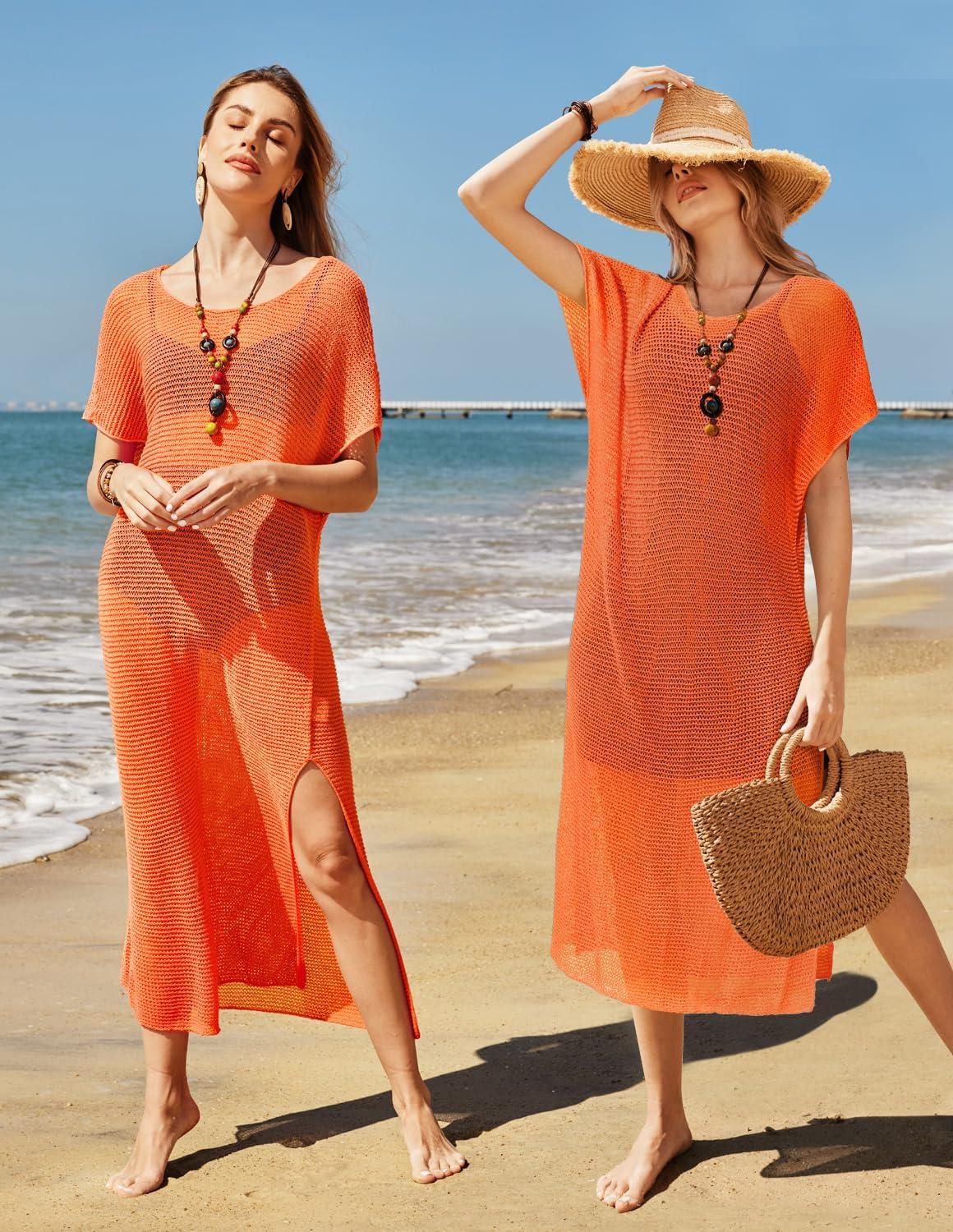 VOTEPRETTY Womens Two Piece Cover Ups Sets Crochet Beach Vacation Summer Swimwear Short Sleeve Outfits Split Knit Long Dress(Orange)