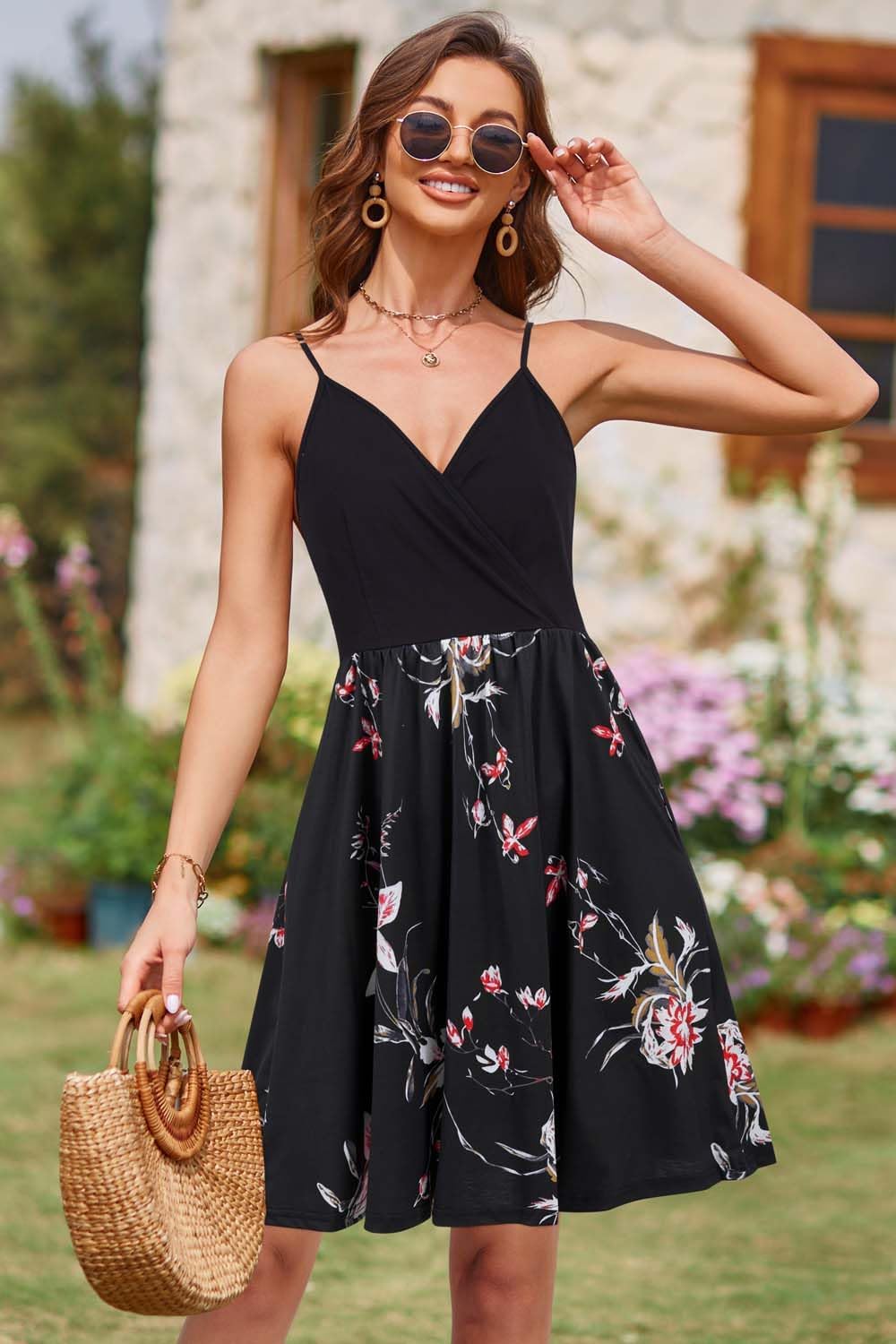VOTEPRETTY Women’s V Neck Floral Spaghetti Strap Sundress Casual Summer Party Swing Dress with Pocket(Floral02)