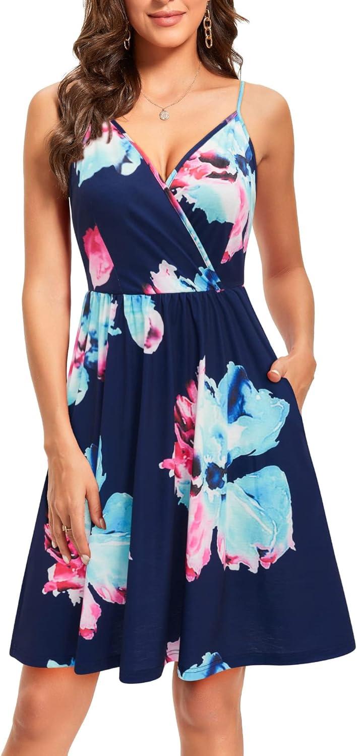VOTEPRETTY Women’s V-Neck Spaghetti Strap Dress Summer Casual Swing Sundress with Pockets(Floral02)