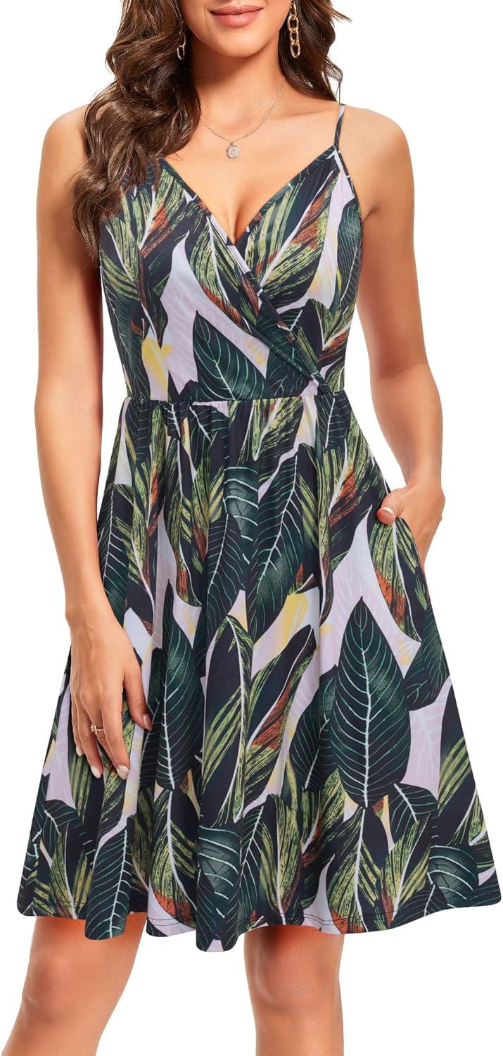 VOTEPRETTY Women’s V-Neck Spaghetti Strap Dress Summer Casual Swing Sundress with Pockets(Floral14)