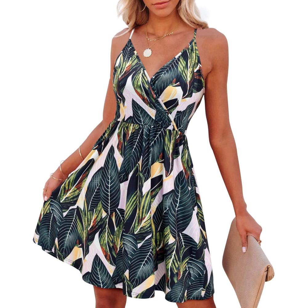 VOTEPRETTY Women’s V Neck Floral Spaghetti Strap Sundress Casual Summer Party Swing Dress with Pocket(Floral27)