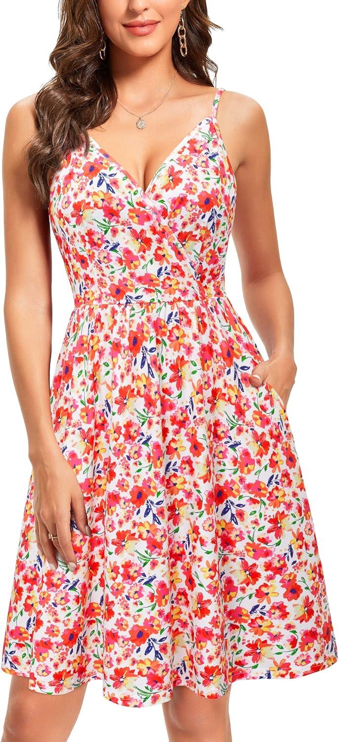VOTEPRETTY Women’s V-Neck Spaghetti Strap Dress Summer Casual Swing Sundress with Pockets(Floral17)