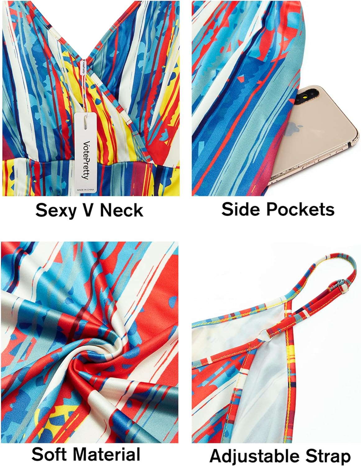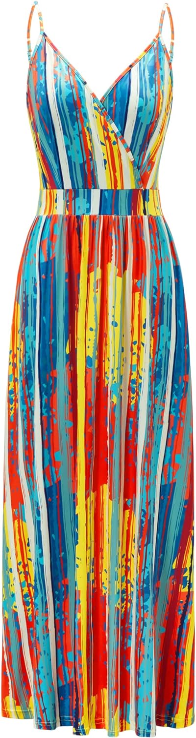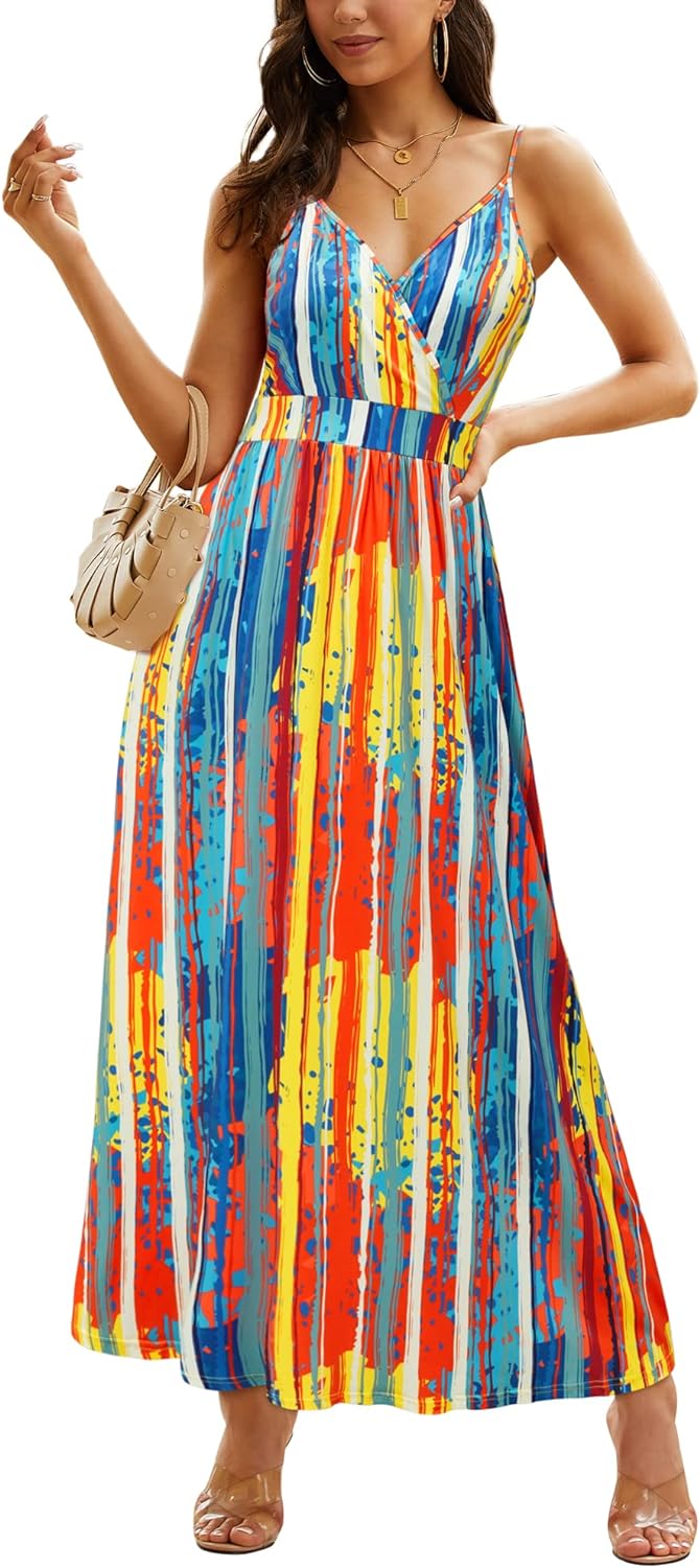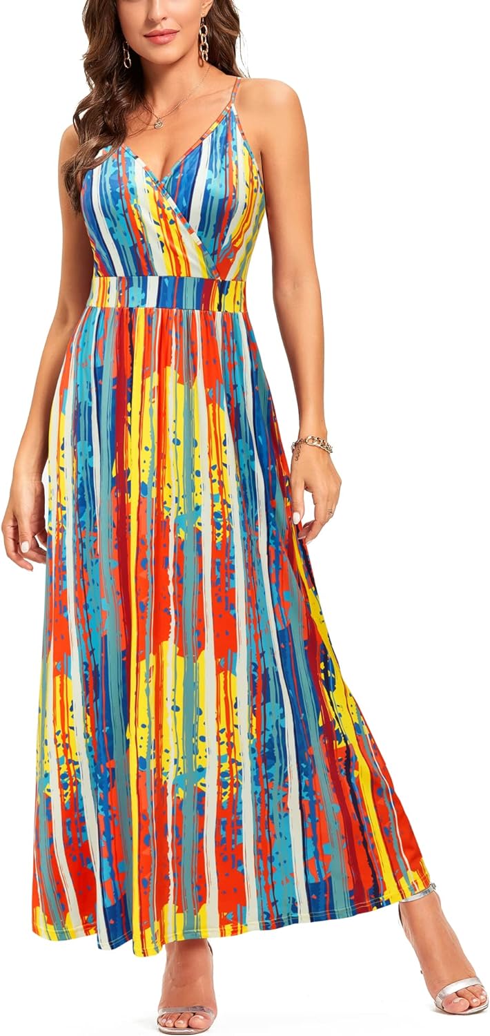 VOTEPRETTY Womens V Neck Wrap Spaghetti Strap Summer Casual Beach Floral Pockets Maxi Dress(Floral18)